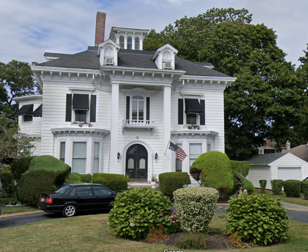 This high-style Second Empire house with stick style trim was built c. 1878 for Azariah S. Tripp, cashier, Metacomet National Bank. It featured slate mansard, Jacobean “sun-bonnet” center gable with solid fretted vergeboard, pedimented windows and portico supports 2nd story bay.