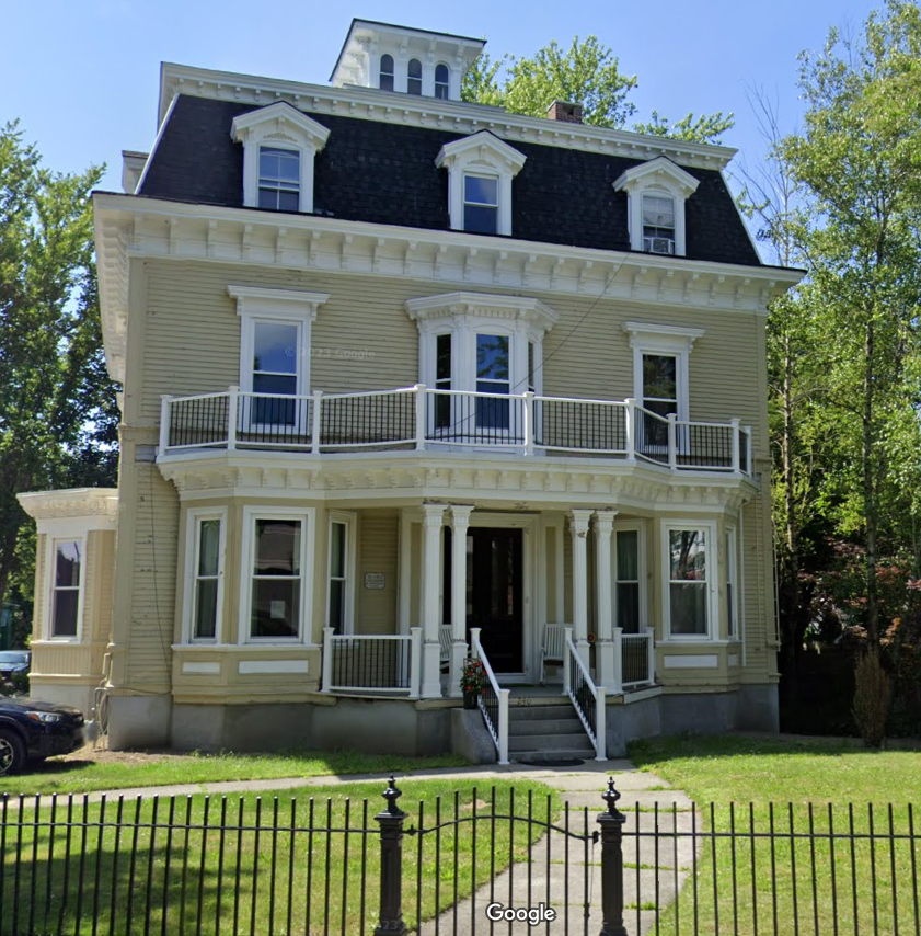 This Second Empire style 2 story house was built in 1880-1 882 by Ichabod Burt, a local builder, for Rachel M. Trafford, second wife and widow of William B. Trafford, a manufacturer who died in 1880. This house featured a mansard style roof, Jacobean center gable with solid pattern verge, elaborate entrance porch with paired piers, second story bay and 3 story engaged turret with tent top. House was sold in 1895 to Alanson J. Abbe, a physician.