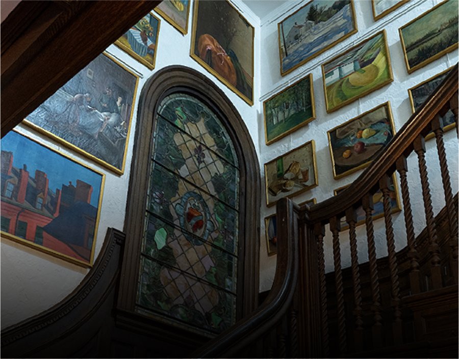 The home on Bemont Street has artistry woven into the very fabric of its architecture, from its intricate stained-glass windows to the magnificent, curved staircase whose walls are lined with Approximately 40 pieces of art that the U.S. Works Progress Administration (WPA) commissioned during the 1930s. The WPA Gallery represents work by regional artists produced in the mid 1930’s as part of the Federal Art Project of the Works Progress Administration, a federal program to create work for artists during the Great Depression.