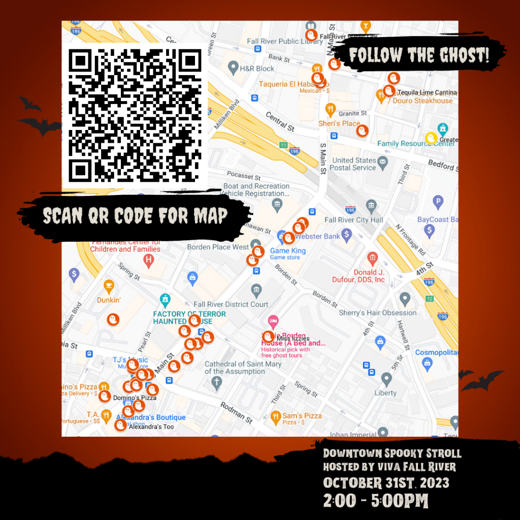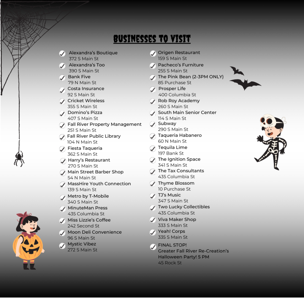 The Downtown Spooky Stroll is back! Join us on Tuesday, October 31, from 2:00 PM to 5:00 PM in Historic Downtown Fall River. Discover over 30 businesses with candy stations, promising a delightful and spooky trick-or-treat adventure, leading up to Greater Fall River RE- Creation’s Annual Halloween Party! Bring your family and friends, dress in your Halloween best, and prepare for an unforgettable day of Halloween magic in the heart of Fall River!
