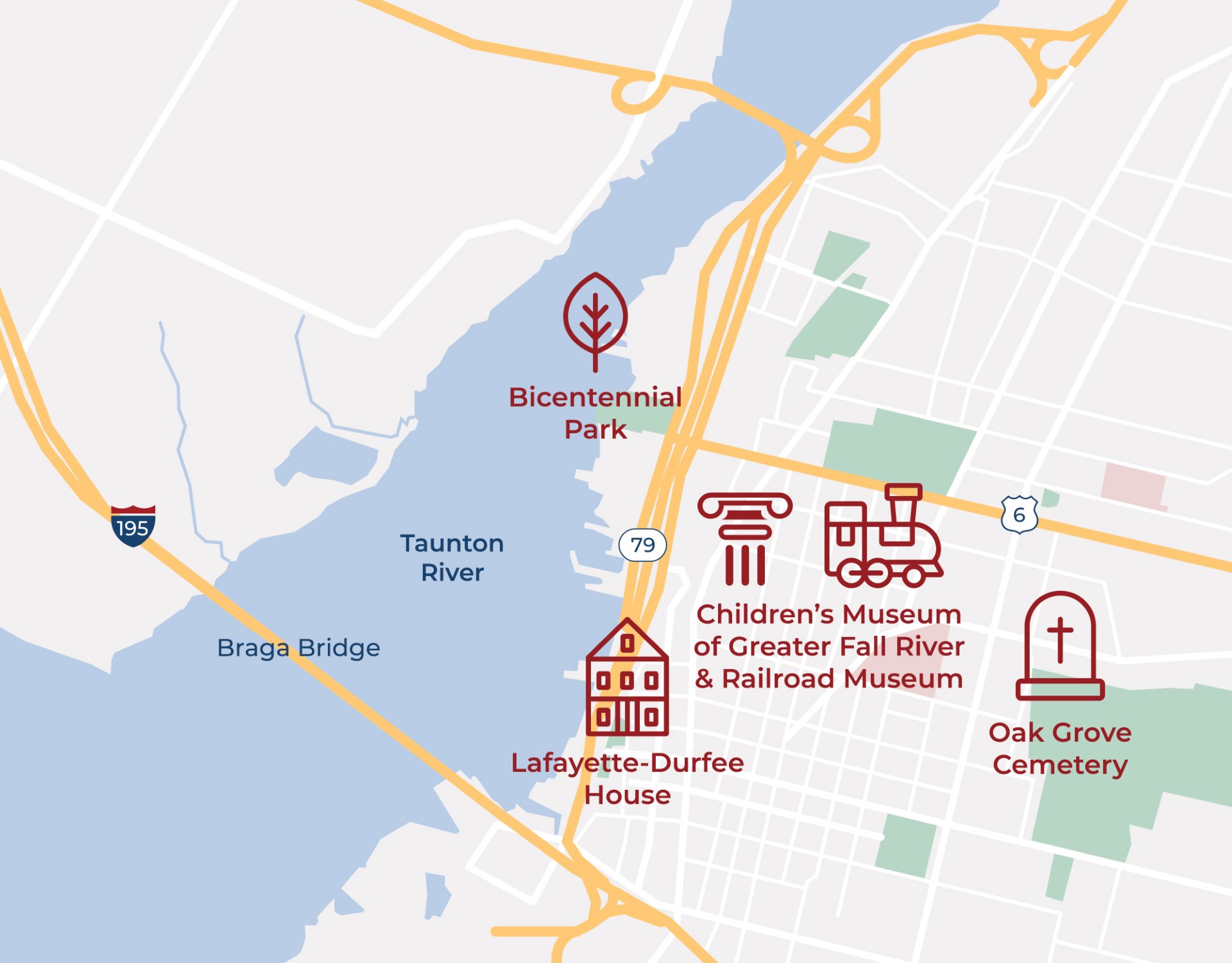 Bordering the Waterfront Cultural District, this region is both a hub of modern enjoyment and a source of optimism for Fall River’s future. The coming years are expected to bring a significant reconstruction of a section of Route 79 in Fall River to create improved public access and add dynamic businesses and activities around the Waterfront. The city is also planning to add a water taxi in Summer 2024.