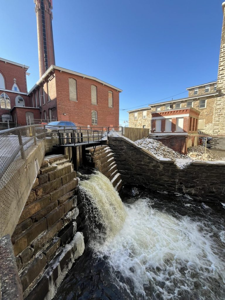 The only remaining waterfall on the Quequechan River in Fall River is hidden behind mills on Anawan Street, near where it empties into the Taunton River.