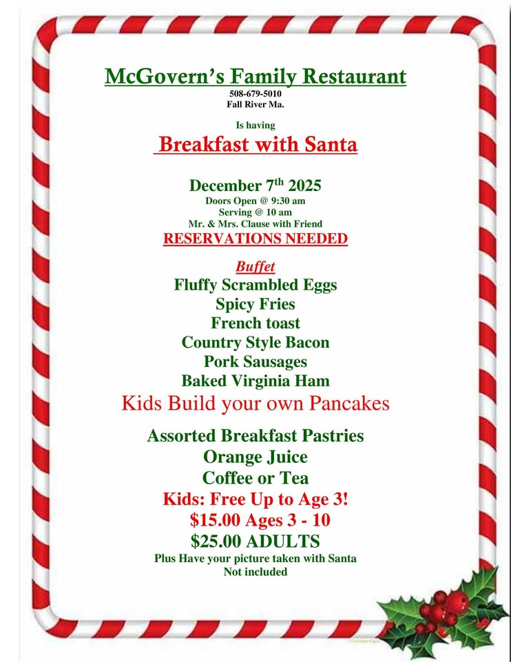 Join us on Sunday December 7th 2025 Breakfast with Santa! Doors open @ 9:30am. Call McGoverns Family Restaurant to reserve your spots.