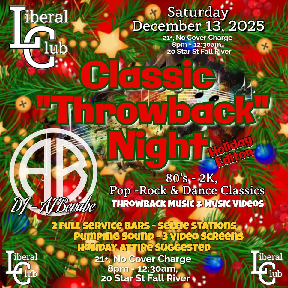 Get Loud For The Holidays! The Liberal Club is hosting a Classic Throwback Night “Holiday Edition” Dance Party with our favorite DJ’s AB Entertainment Services (Armand & AJ Berube). We invite you to come out and join us dressed in your UGLIEST and LOUDEST holiday attire!!! Be prepared to dance your *ss off to your favorite 80’s – 2K Pop, Rock & Dance Club Classics. A little different than our “Classic Club Nights’, we’ll be throwing in a good dose of Pop & Rock Classics from back in the day too. A Full Night of Classic Music and Music Videos . Mark your calendar now don’t miss one of the GREATEST holiday parties you will attend this year!! 3 Video Screens, Pumping Sound, Selfie Stations & more…. 21+, No Cover Charge
