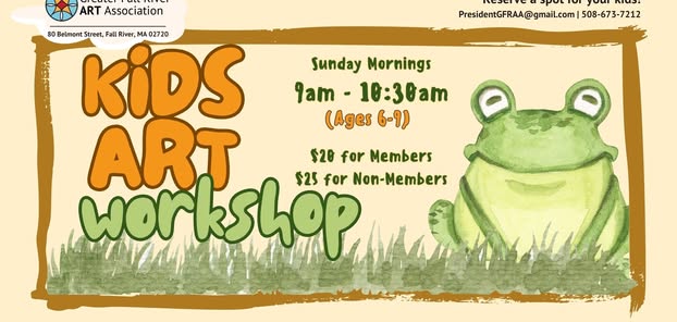 The Greater Fall River Art Association has Kids Art workshops taught by Mr. Ernie. For kids ages 6-9 years old we have Saturday morning and Sunday morning options. For kids aged 10-12 years old we have one Saturday morning workshop. Sign up your little ones and watch them grow in art fundamentals! Maximum of 8 kids per session. Supplies provided.