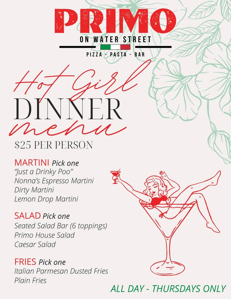 Hot Girl Dinner (Thursdays thru 8/27) Aug 27 Hot Girl Dinner (Thursdays thru 8/27) 11:00 am - 9:30 pm
