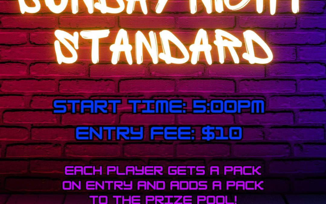 Every Sunday Night we run a Standard.Start Time: 5:00pmEntry Fee: $10Each player gets a pack and adds a pack to the prize pool.These events will be a 4 round cap.Come join in on the Fun!