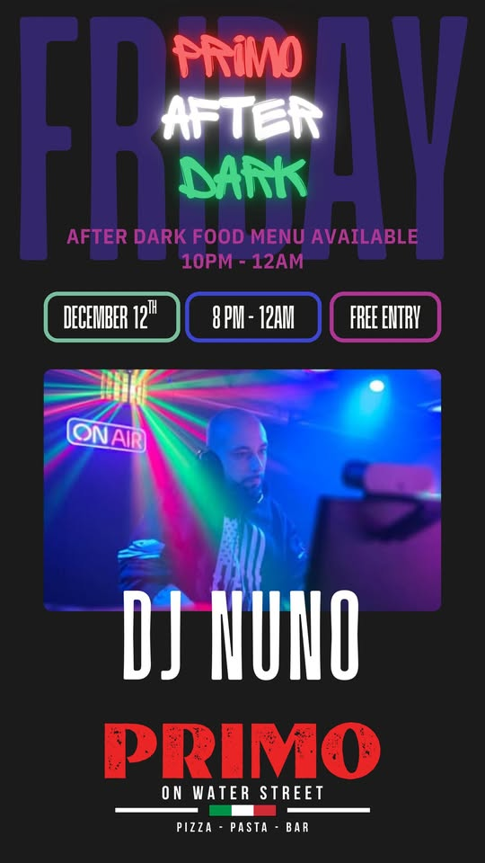 DJ Nuno Live!After Dark Food Menu Available 10pm - 12amEat, Drink, Dance at Primo's!No Cover21+ Event - Proper Dress Required