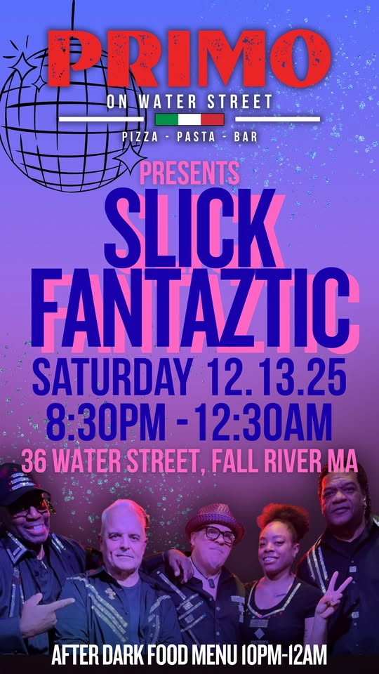 Get ready for a night of soul, style, and nonstop energy as Primo on Water Street proudly presents Slick Fantaztic! This powerhouse band brings unmatched soulful vocals, smooth grooves, and party-starting vibes that will have you dancing from the moment they hit the stage.Join us on Saturday, December 13th from 8:30PM to 12:30AM for a high-energy performance that blends throwback funk, feel-good soul, and crowd-moving hits. Slick Fantaztic knows how to fire up a room and they ALWAYS bring the party!Come early, stay late, and make a night of it.Our After Dark Food Menu will be available from 10PM to 12AM to keep you fueled while you groove.It’s the kind of night you don’t just attend — you feel it. Don’t miss it!  Location: 36 Water Street, Fall River, MANo Cover21+ EventProper Dress Required