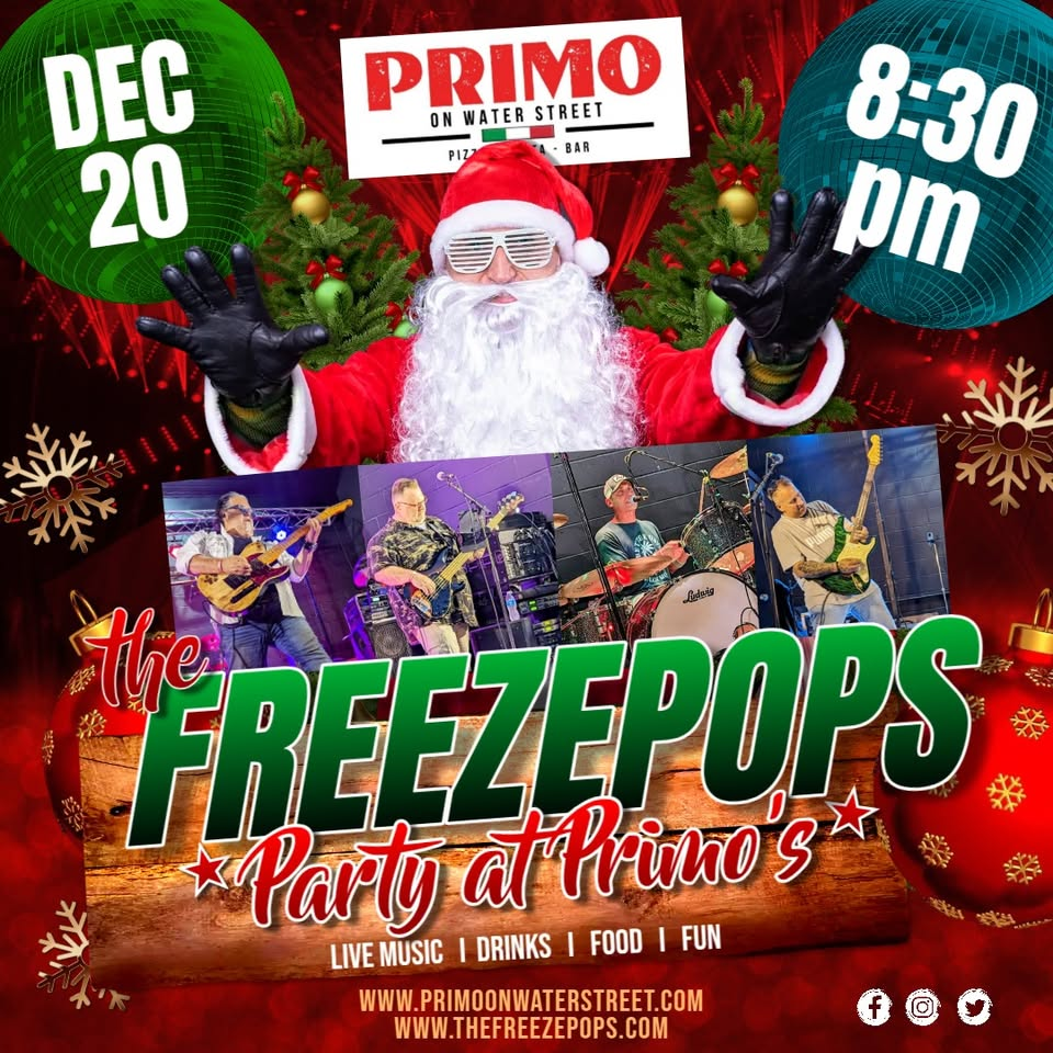 Get ready to rock around the Christmas tree at Primo on Water Street!  Join us Friday, December 20th at 8:30 PM for an epic night with The Freezepops — bringing their high-energy mix of hits that’ll have you dancing, singing, and feeling that holiday cheer all night long!  Party at Primo’s means:  Delicious food  Festive drinks  Live music & nonstop fun  Holiday vibes from start to finishBring your friends, your best dance moves, and your holiday spirit — because Santa’s making a stop at Primo on Water Street for one unforgettable Christmas party!