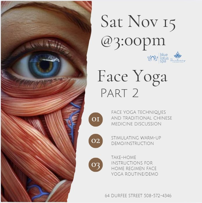 Sanctuary - Wellness & Yoga Studio 64 Durfee St, Fall River, MassachusettsLet's continue to dive deeper into specific facial exercises that strengthen and release congestion and stagnation in the facial muscles. You will learn a sequence of postures that will facilitate a more subtle, youthful appearance and glow. We will discuss Chinese medicine and how it relates to different areas of the face and how we can move Chi (energy) by manual manipulation. Special bonus of a warm-up routine and product introduction. This is an educational and FUN class for all ages. TICKETS